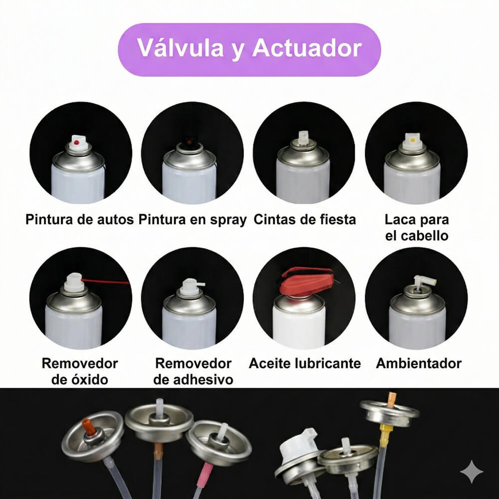 Además, para planificar tu producción, debes considerar el diámetro del envase (para asegurar que sea compatible con las mordazas de tus máquinas envasadoras) y el tipo de boquilla o actuador, ya que de esto dependerá el patrón de rociado final que experimentará tu cliente (desde trazos finos para rayones, hasta abanicos anchos para pintar facias o muros).